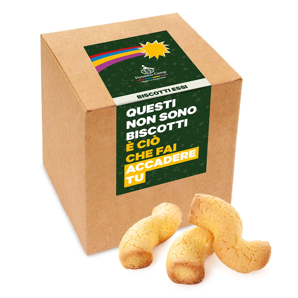 Biscotti Essi 150 g tipici veneziani in astuccio di cartoncino kraft 100% biodegradabile e compostabile con etichetta in carta. Pensati per fare del bene: i biscotti Dynamo sono un dono dolce che cambia le cose.